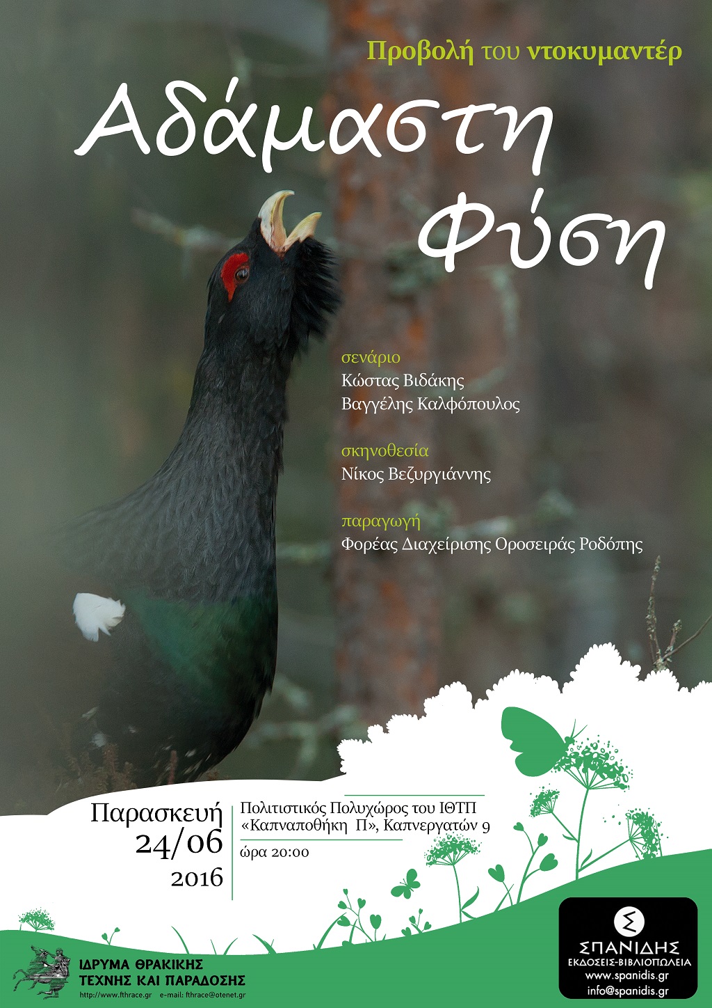 Την Παρασκευή 24 Ιουνίου και ώρα 20:00, θα πραγματοποιηθεί εκδήλωση του Ιδρύματος Θρακικής Τέχνης και Παράδοσης στην οποία θα προβληθεί το ντοκιμαντέρ του ΦΔΟΡ «Αδάμαστη Φύση» που αφορά το Εθνικό Πάρκο Οροσειράς Ροδόπης (ΕΠΟΡ). Η εκδήλωση θα πραγματοποιηθεί στον Πολιτιστικό Πολυχώρο του ΙΘΤΠ, «Καπναποθήκη Π», Καπνεργατών 9, στην Ξάνθη.