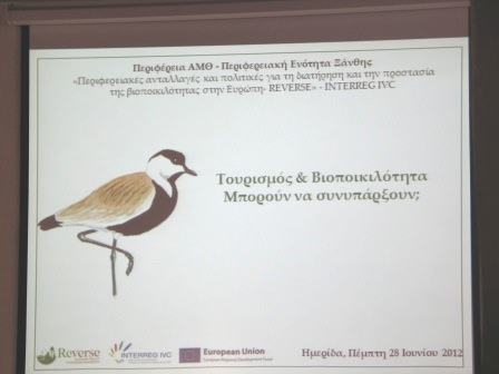 Ο Φορέας Διαχείρισης Οροσειράς Ροδόπης συμμετείχε σε ημερίδα που διοργάνωσε η Περιφερειακή Ενότητα Ξάνθης, στα πλαίσια του ευρωπαϊκού προγράμματος "Περιφερειακές ανταλλαγές και πολιτικές για τη διατήρηση και την προστασία της βιοποικιλότητας στην Ευρώπη - REVERSE - INTERREG IVC" με τίτλο "Τουρισμός & Βιοποικιλότητα - Μπορούν να συνυπάρξουν;". Η ημερίδα πραγματοποιήθηκε στο Ίδρυμα Θρακικής Τέχνης και Παράδοσης στην Ξάνθη την Πέμπτη 28-06-2012. Το Φορέα εκπροσώπησε η δασοπόνος κα Ελένη Χατζηαναστασίου που παρουσίασε εισήγησή της με θέμα "Ανάπτυξη του τουρισμού στο Εθνικό Πάρκο Οροσειράς Ροδόπης - Σημερινή κατάσταση και προοπτικές".