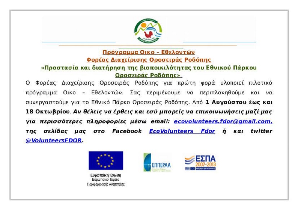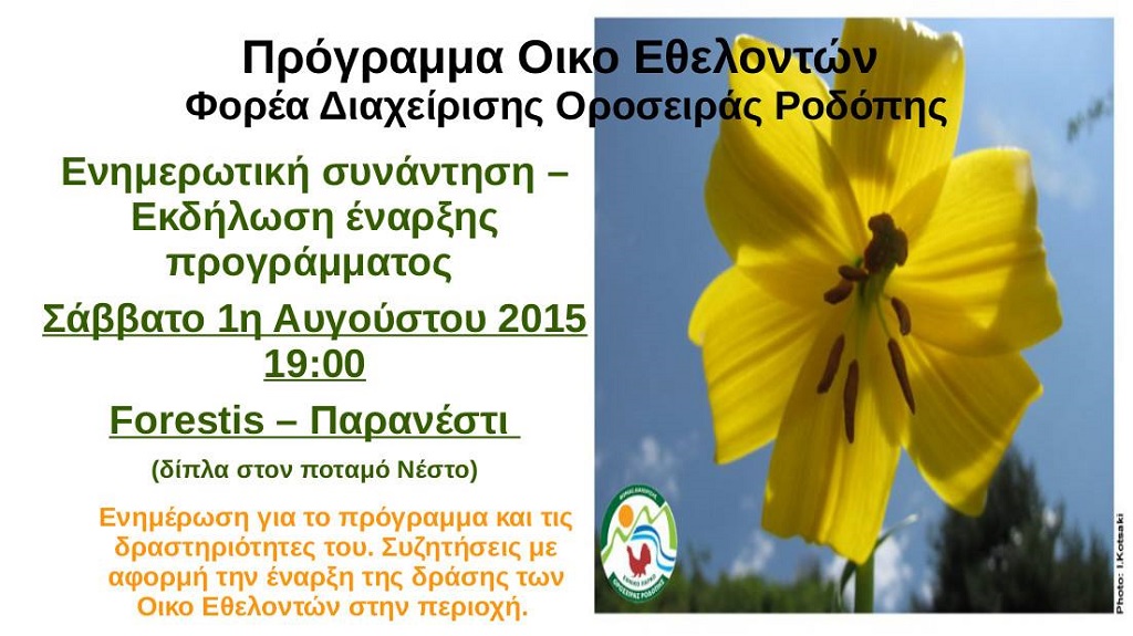Ενημερωτική συνάντηση - Εκδήλωση έναρξης του προγράμματος οικο-εθελοντών του Φορέα Διαχείρισης Οροσειράς Ροδόπης