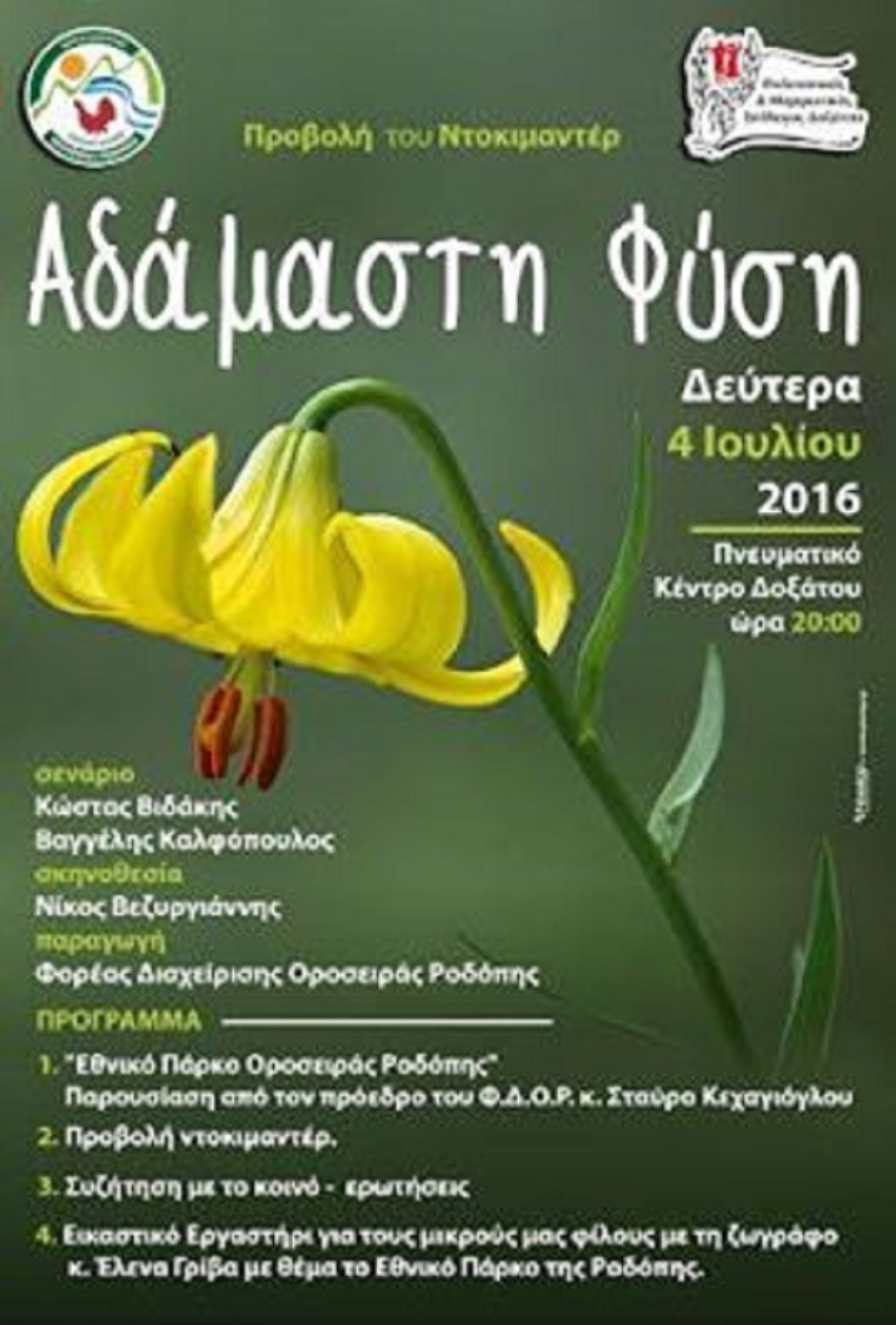 Τη Δευτέρα 4 Ιουλίου στις 20:00 θα πραγματοποιηθεί προβολή του ντοκιμαντέρ του Φορέα Διαχείρισης Οροσειράς Ροδόπης "Αδάμαστη Φύση", παραγωγή της "SEGULL WORKS", που αφορά το Εθνικό Πάρκο Οροσειράς Ροδόπης. Η προβολή θα γίνει στο πλαίσιο εκδήλωσης που συνδιοργανώνεται από το Πολιτιστικό Μορφωτικό Σύλλογο Δοξάτου και το ΦΔΟΡ στο Πνευματικό Κέντρο Δοξάτου.